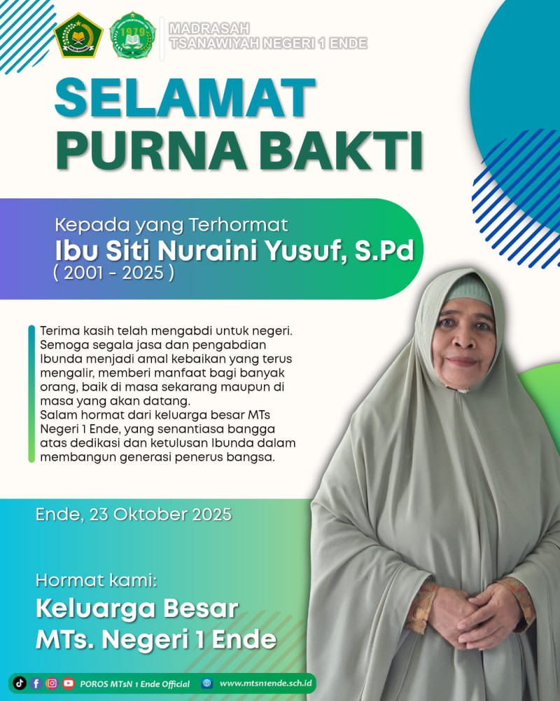 “Terima kasih atas pengabdian, ketulusan, dan jejak kebaikan yang Ibu tinggalkan di MTsN 1 Ende. Semoga masa purna tugas menjadi awal kebahagiaan baru,” demikian ungkapan perpisahan yang penuh kehangatan.