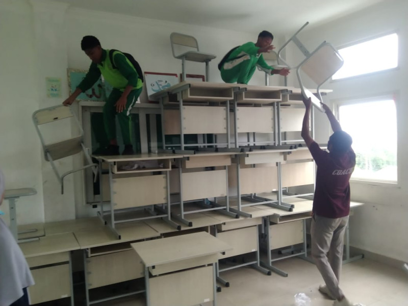 bahu membahu mengangkat meja, kursi, papan tulis, lemari, dan perlengkapan